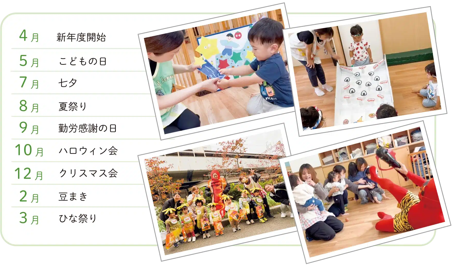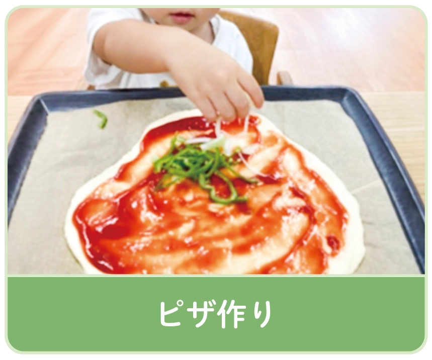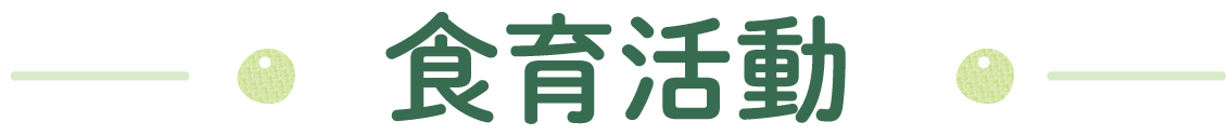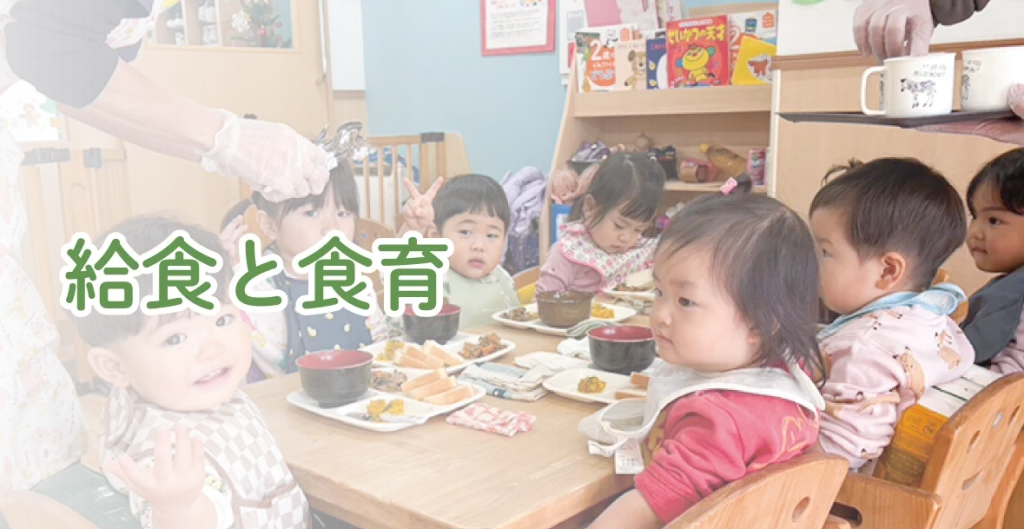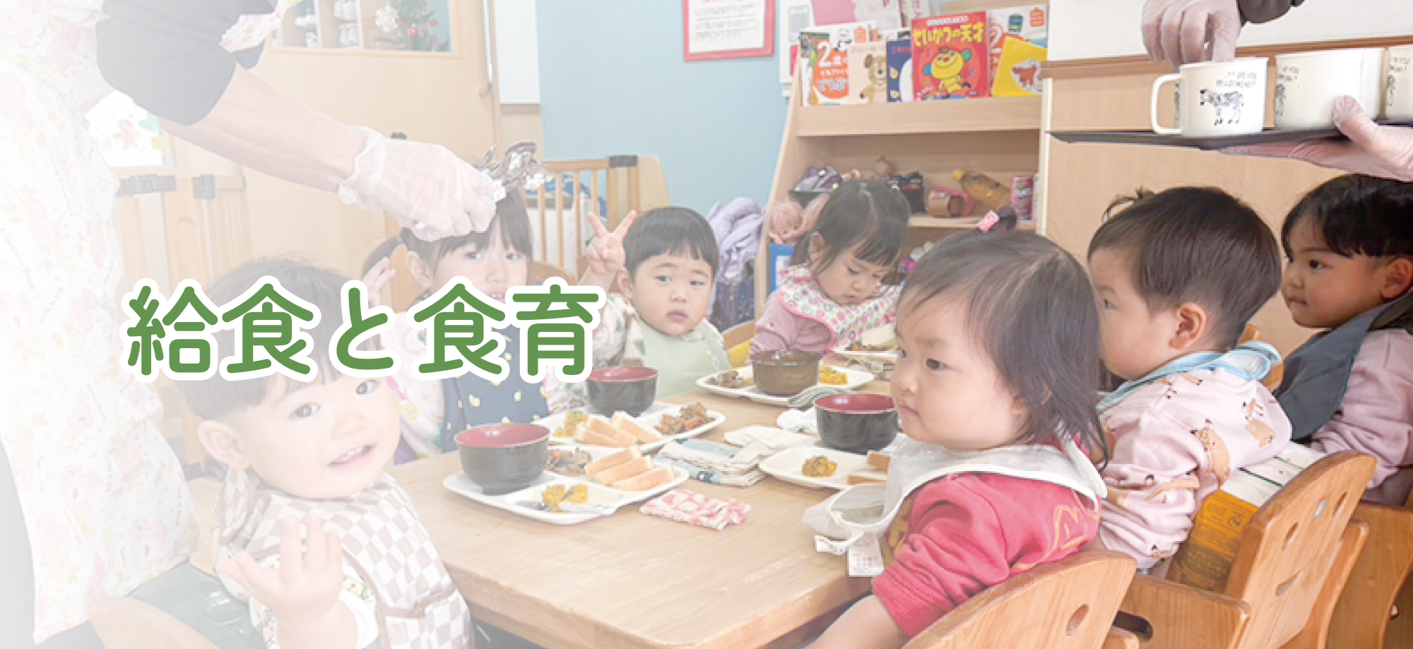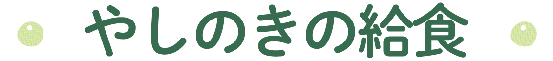 やしのき保育園では、専属の栄養士が献立を作成し園内で調理しています。 毎日の食事から季節の行事食、楽しい食事の雰囲気をつくりながら、子どもの食べる意欲に繋げられるよう工夫しています。また、子どもたちが直接食材に触れる時間、お手伝いする時間を大切にすることで、食へ関心を持つきっかけとなっています。 午前中にはからだを使って遊ぶことで給食の時間にお腹がすくような習慣づくりを心がけており、「いただきます」の挨拶やマナーも学んでいます。
