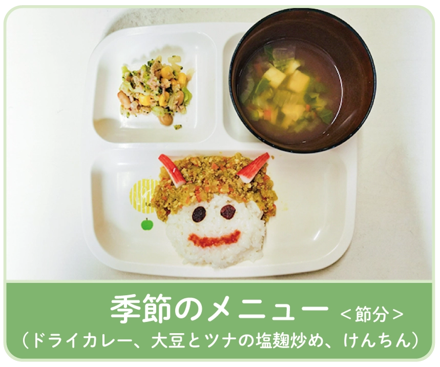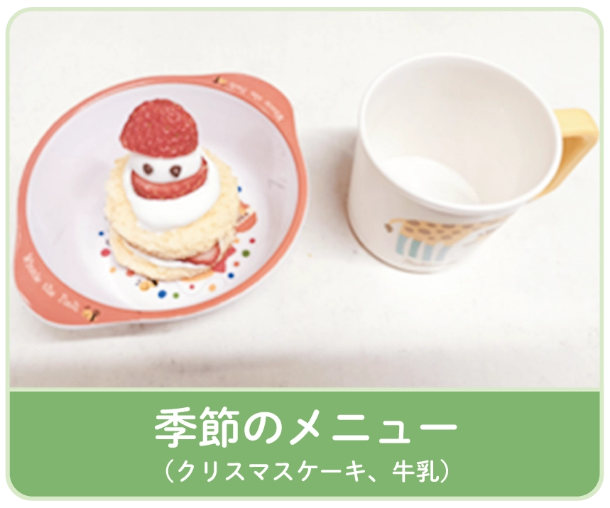 ・毎月お配りする献立に目を通していただき、園で初めて口にする食品がないよう にご協力をお願いいたします(アレルギー防止のため)。