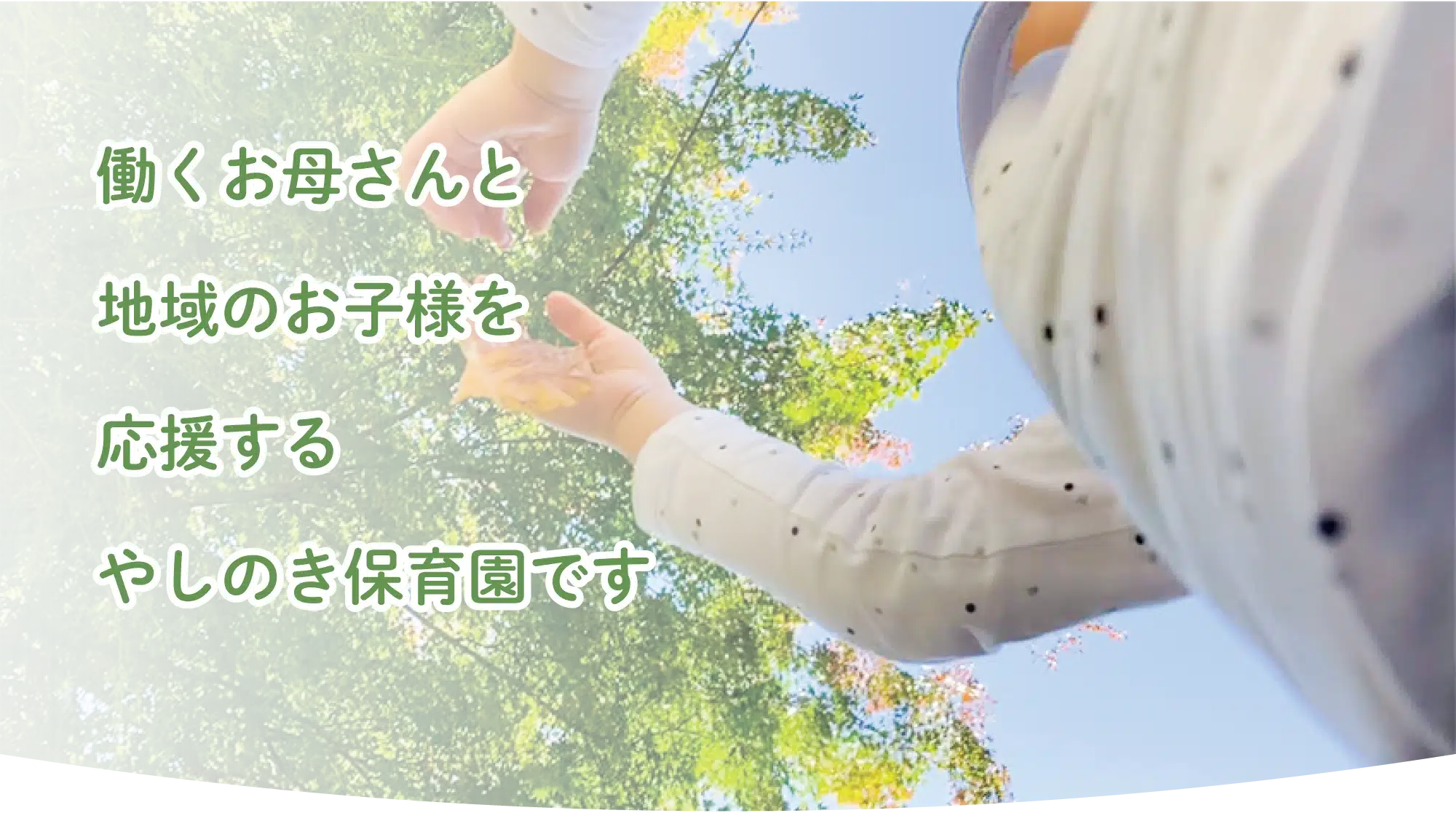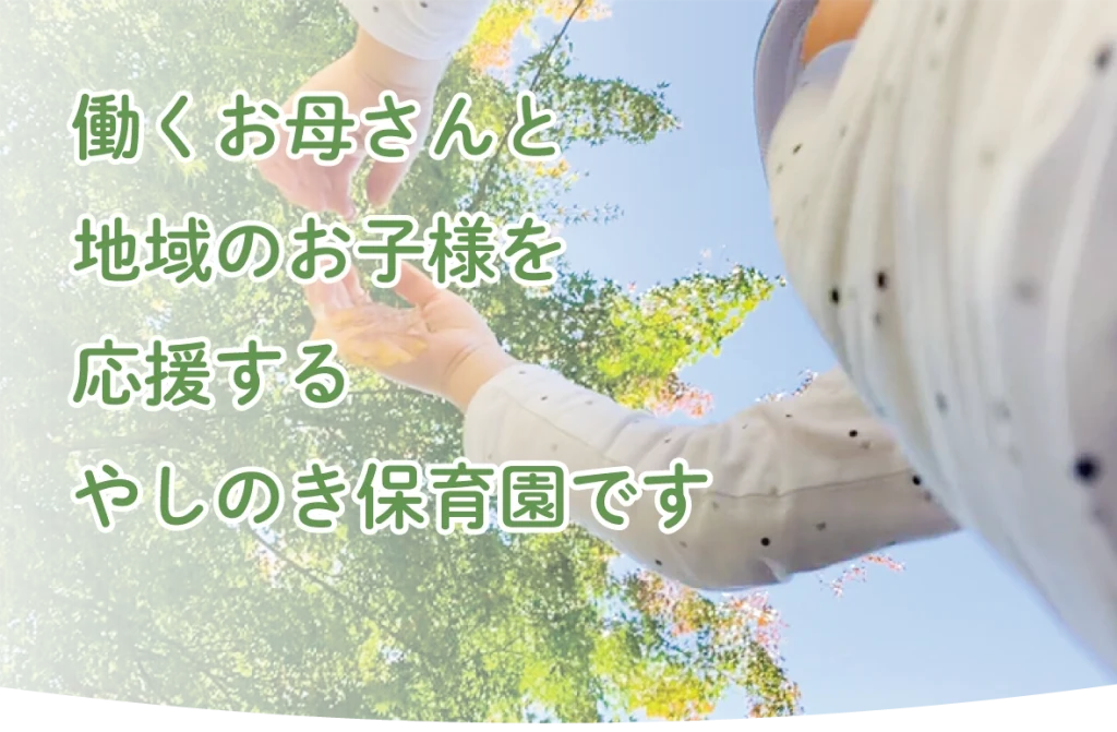 やしのき保育園は、小規模保育園で0才〜2才児までの12名定員の施設です。人間の成長期で最も大切な幼時期にあたり、人格形成の土台になる時期だからこそ経験豊富な保育士が深く関わり愛情を注ぎ、栄養を管理できる栄養士の食事で食育も可能となり、フィジカル・メンタルを含め、自立や成長を促す事が実現できます。運営にあたっては、園長をはじめ職員一同『安心安全な保育』を心がけ、定期的な安全対策も実施し、保護者様に喜んでいただける環境づくりを日々追求しております。また、今後も店舗展開を計画しており日本の『未来』を支える役割を果たしていく所存でございます。